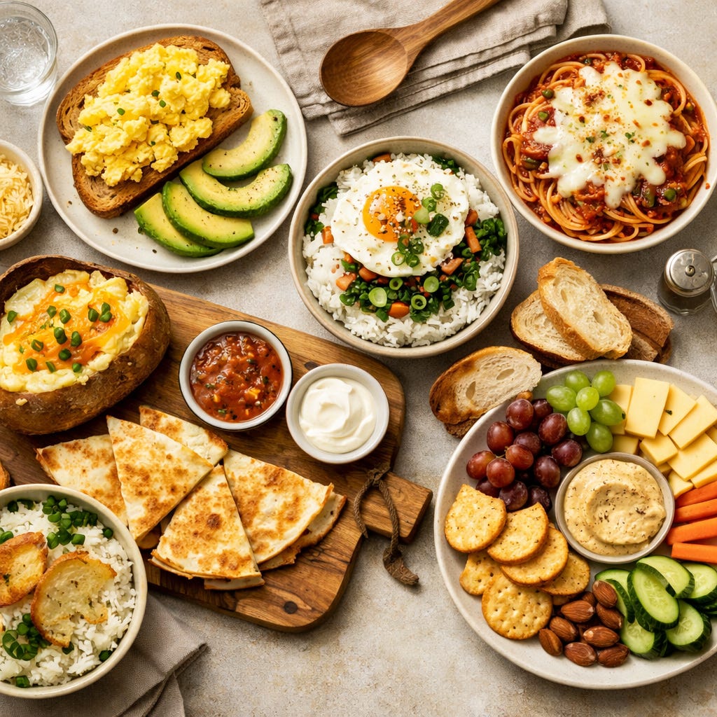 The easiest meals also tend to lean on ingredients that do a lot of work fast: eggs, pasta, broth, bread, cheese, rotisserie chicken, canned beans, frozen vegetables, jarred sauces, potatoes, and pantry seasonings.